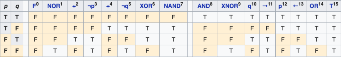 The number of connectives grows extremely fast with the arity (there are binary-logical-connectives, 3-ary-logical-connectives, 4-ary-logical-connectives, 5-ary-logical-connectives, etc.), but luckily, the great majority of these connectives are redundant (they can be constructed, via equivalences, using other connectives) so we can use a much smaller number of them. F.e., we can see in the table of the binary-connectives that the values are mirrored, i.e. the 8 connectives of the left are just the negation of the 8 on the right. Therefore, we can construct the 16 possible binary-connectives with just 8 and the unary-connective of negation (). Furthermore, we can note that the negation is equivalent to the NOR connective applied to the same proposition (NOR), so we don’t need the negation anymore, we can construct the 16 binary-connectives using just the 8 of the left. The excellent news is that we can continue this search to find that we can construct any connective (of any arity!!) using only just one binary-connective! (namely the NOR or the NAND connectives). This property is known as NAND completeness (or NOR completeness).