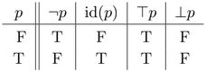 The 16 logical-connectives of the previous table let us create 16 new compound-propositions from 2 previous atomic-propositions, but a logical-connective can create a new compound-proposition from only one atomic-proposition . The four possible combinations are: let the truth-values of untouched, which is known as the identity-connective, invert them, which is known as the negation connective (), make them always True, known as the tautology connective () and make them always False, known as the contradiction connective ().